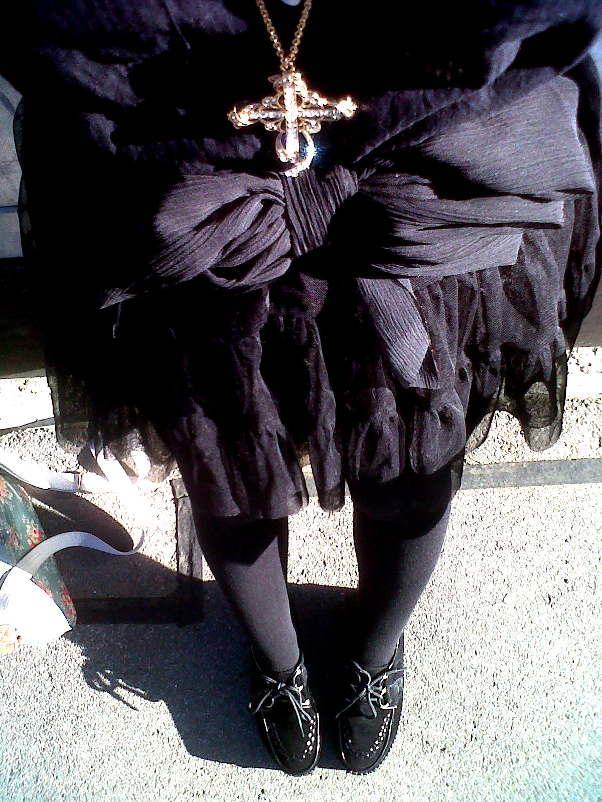 … Summer Goth. Because I’ve always wondered what Goths wear in the summer. And here it is. Creepers, black tutu, black tights, black shirt with rolled up sleeves, black bow belt, gold crucifix. I never plan these things, they just happen. Why today? The sun was shining merrily when I woke up but Goth is still what came out. That said, I’m not too hot so I’d judge it a success. I was born to wear black.