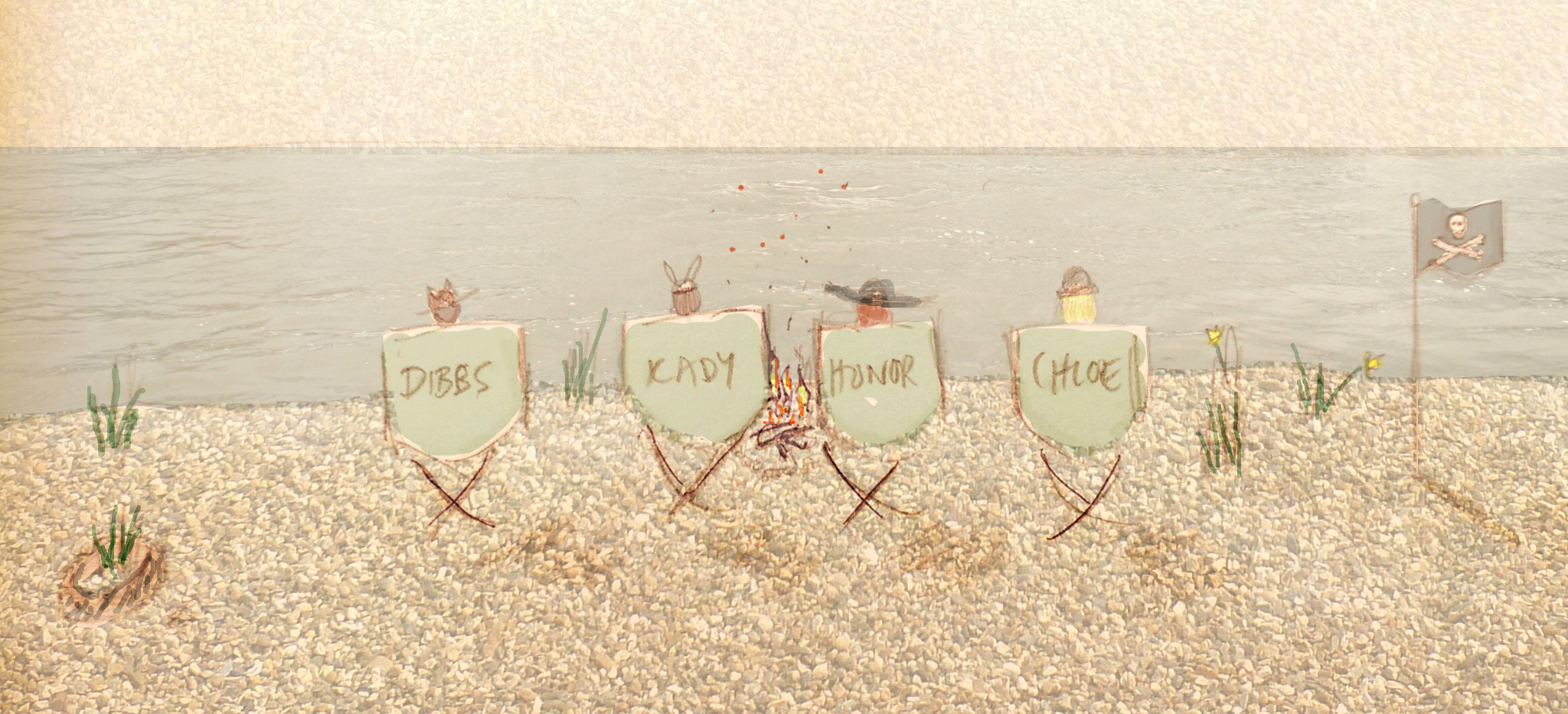 This is a photograph of me and my copybuddies sitting on some wasteland by the Thames, wearing bold headwear, big jumpers and celebrity sunglasses. We have a Thermos, in which there is something potently warming. We built that fire out of some old pallets. I don’t know where we got our personalised director chairs from but they’re great. They’re the oversized kind that make you look like tiny children, as you can see.