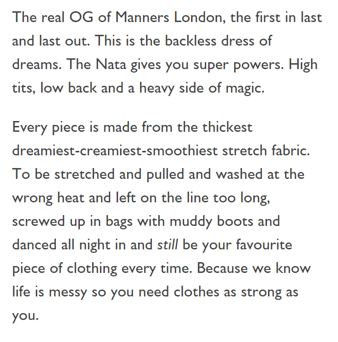 I recently saw a brand on Instagram called Manners London and posted some of their website copy. We started discussing it between us and got more and more obsessed with the whole vibe, which was all about simple, handmade, ethical clothes that make women feel powerful with zero fuss.