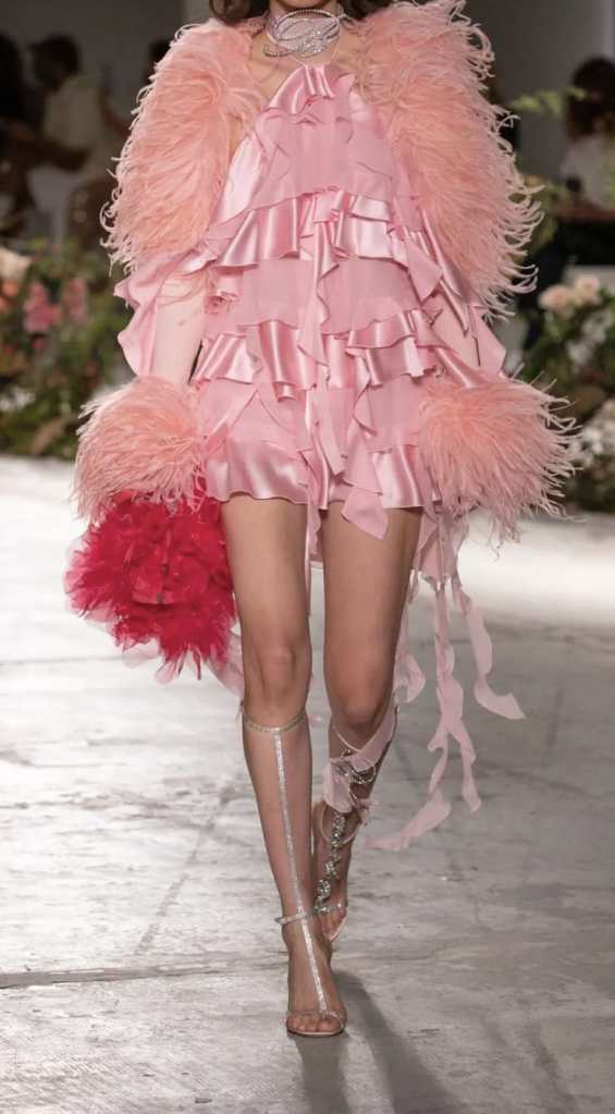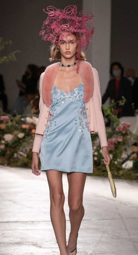 But one other name springs to mind when I watch the opening titles: Blumarine. To me, Blumarine has an arch awareness to it. They may be all babydolls and maribou, but they’re also seduction and sarcasm. Insouciant excess. A fashion house for ruined heiresses.