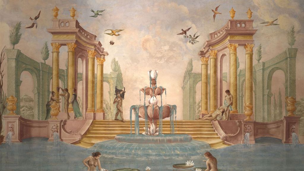 The frescoes are an amalgamation from Villa Tasca in Palermo, but fucked with by illustrator Lezio Lopes. The same artist (and studio) created the wallpaper in season one’s florid, floral credits.