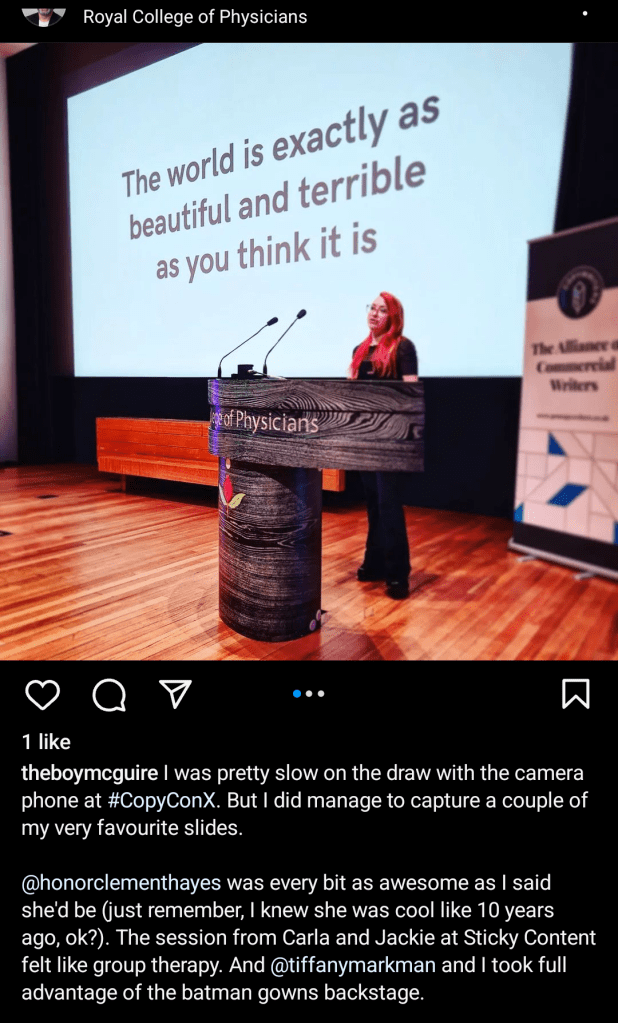 It was nice though, because people were very sweet to me. Which I needed, as I was in the odd situation of being nervous in theory. The beta blockers I take every day seemed to have rendered me incapable of the physical jitters I associated with public speaking in the past. I delivered this talk from outside of my body and with zero thoughts, rather than trapped in a rattling cage of anxiety.