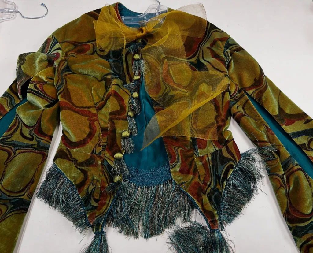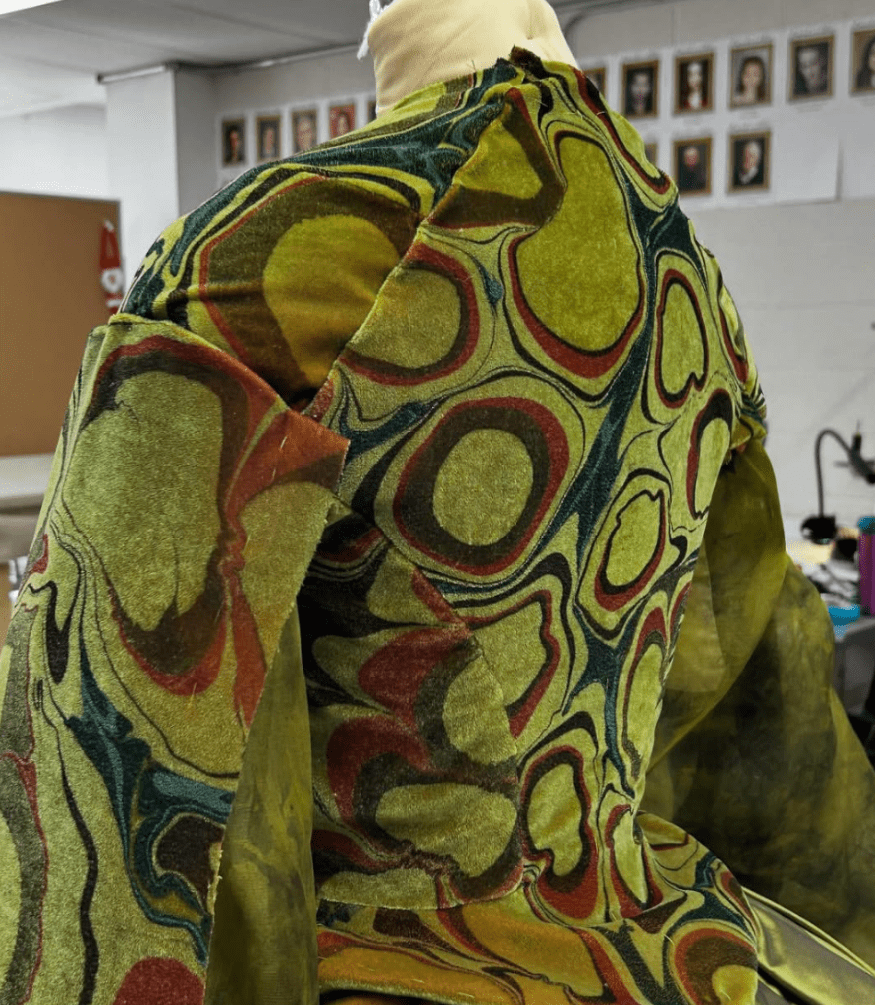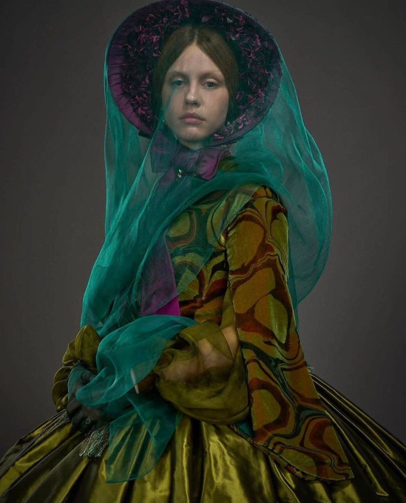 Mia Goth wears an enthralling array of butterfly-wing, beetle-shell, mossy, mouldy colours and textures. I looked into her green marbled jacket and it is indeed marbled velvet, inspired both by the damp of Frankenstein’s tower and the end papers of Elizabeth’s books. Every look is a glorious reflection of her own fascinations: she’s a scientist in her own right and loves insects above all.
