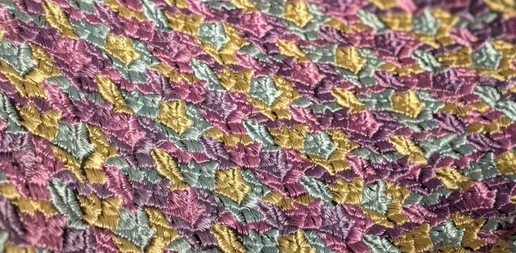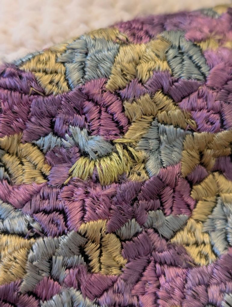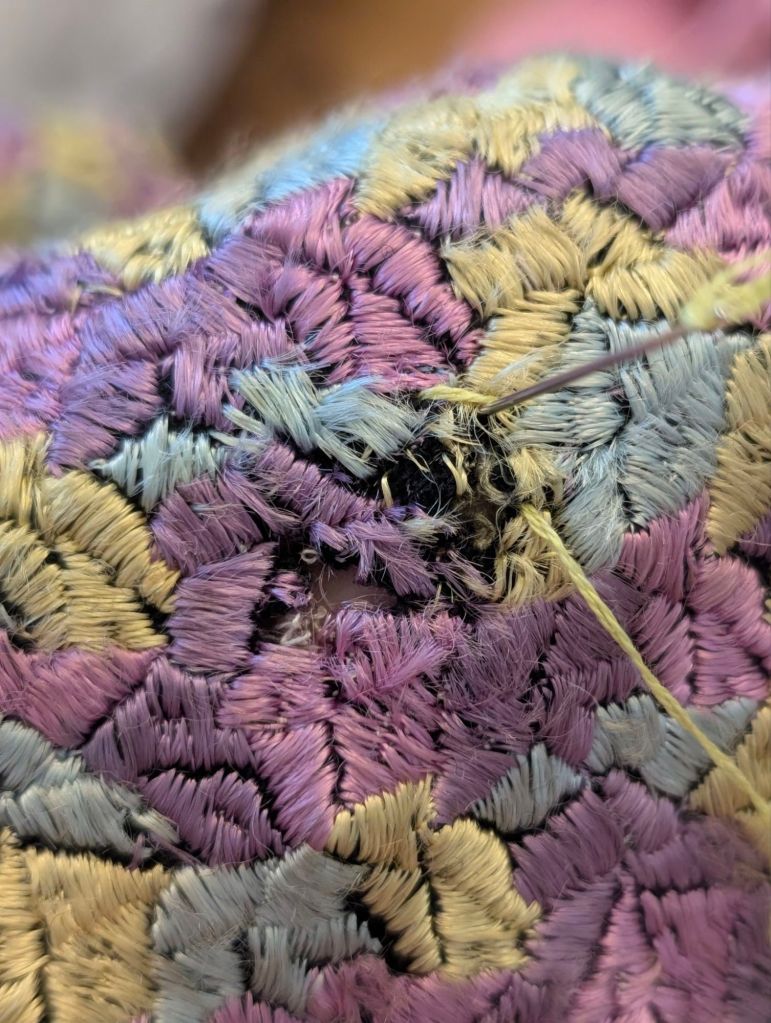 I found some approximate colours in my stash and set about stitching up the holes and any potential issues. The holes themselves don’t show if you’re not eyeballing, so I was really just shoring them up for another hundred years. I’ll cover these foundation stitches with proper silk stitching in the right colours as they come to me. Eventually, my mends will be invisible.